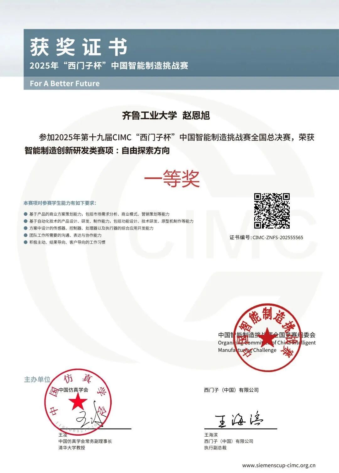 近日,2025年第19屆CIMC“西門子杯”中國智能制造挑戰賽全國總決賽落下帷幕,由強遠激光專家指導,齊魯工業大學碩士研究生張延魯、趙恩旭等同學組成的參賽團隊,憑借“高速棱鏡激光清洗系統”項目勇奪全國總決賽一等獎!這是我公司深化產教融合、推進校企協同創新的又一重要成果。